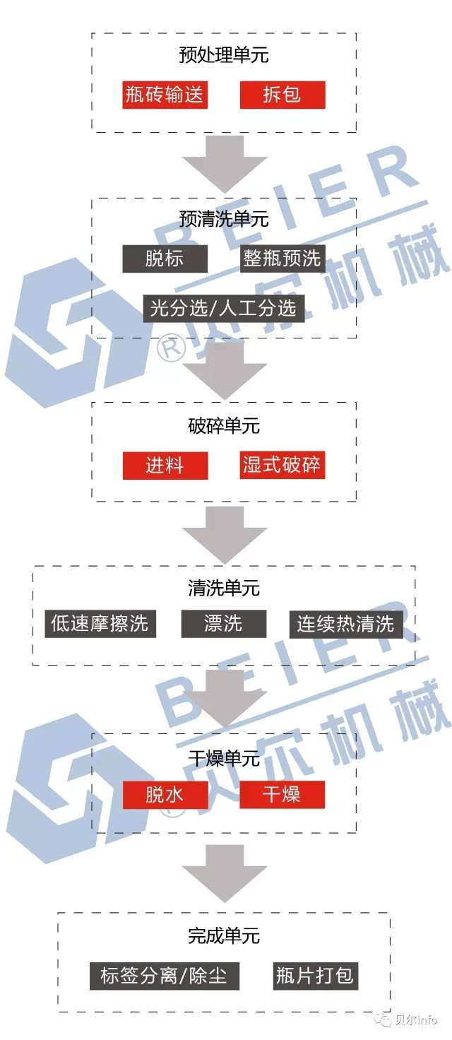 回收的PET塑料瓶,首先經(jīng)過"脫標(biāo)機(jī)"去除瓶身的標(biāo)簽,然后經(jīng)過"平面分選輸送機(jī)",在此步驟挑選出物料中的雜色瓶(如綠色瓶、藍(lán)色瓶、殘余雜質(zhì)等),再進(jìn)入"破碎機(jī)"進(jìn)行粉碎,出來后進(jìn)入"漂洗水槽"進(jìn)行分離(實(shí)現(xiàn)PET瓶片與PP標(biāo)簽紙、瓶蓋的分離),分離干凈后進(jìn)入"熱清洗單元"進(jìn)行加熱清洗,出來后再進(jìn)入"漂洗水槽"進(jìn)行漂洗(去除高溫加熱中的清洗劑),最后進(jìn)入"脫水機(jī)"脫水后直接裝包。針對(duì)產(chǎn)量大、瓶片級(jí)別高我們可通過整瓶預(yù)洗環(huán)節(jié)、脫標(biāo)分揀環(huán)節(jié)、初碎環(huán)節(jié)、初洗分離環(huán)節(jié)、高溫清洗環(huán)節(jié)、中和清洗環(huán)節(jié)、漂洗干燥環(huán)節(jié)、瓶片精選環(huán)節(jié)等整套精洗環(huán)節(jié)來達(dá)到高精凈片。此流程為常規(guī)流程,亦可根據(jù)客戶需要設(shè)計(jì)不同生產(chǎn)解決方案。